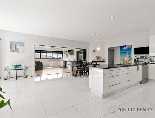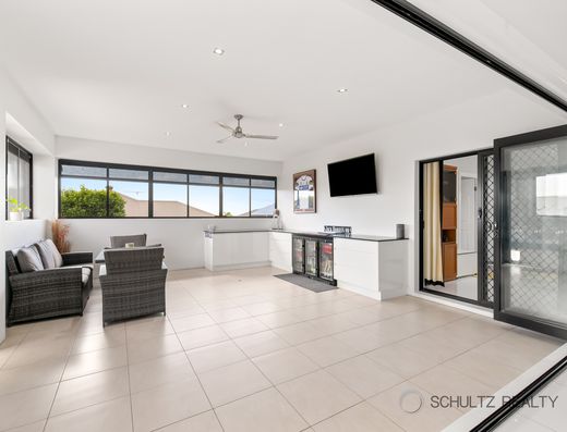 - Open planned tiled kitchen/dining/living area with air conditioning, ceiling fan and sliding door to the covered outdoor area