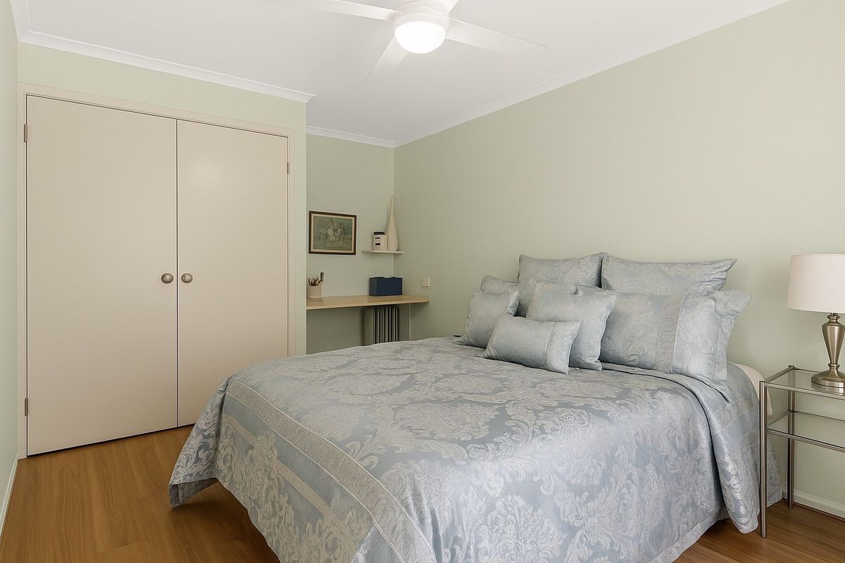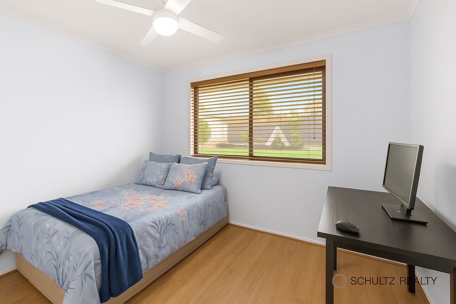 • Bedroom with built-in robe, venetian blinds and ceiling fan
