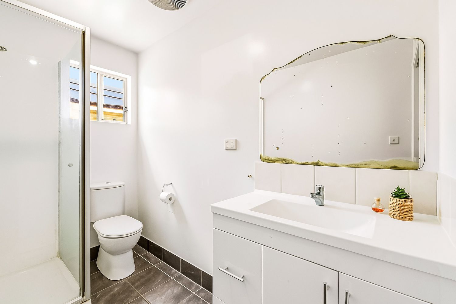 • Bathroom with shower, vanity, and toilet