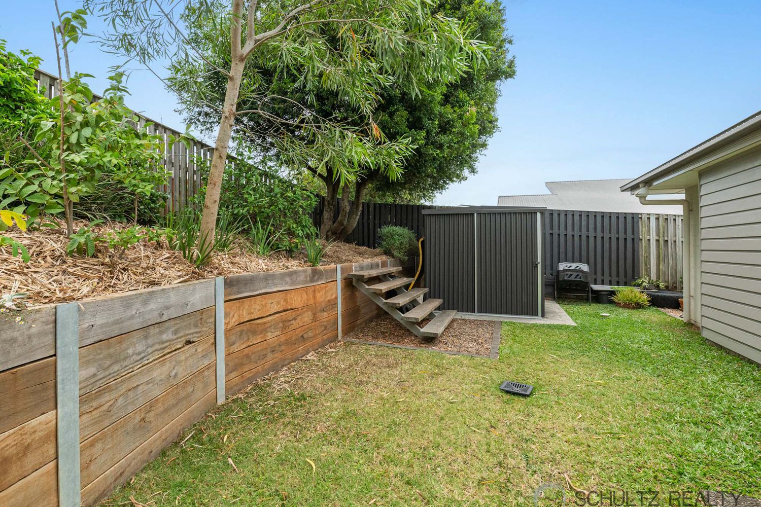 - Grassy yard with well established gardens