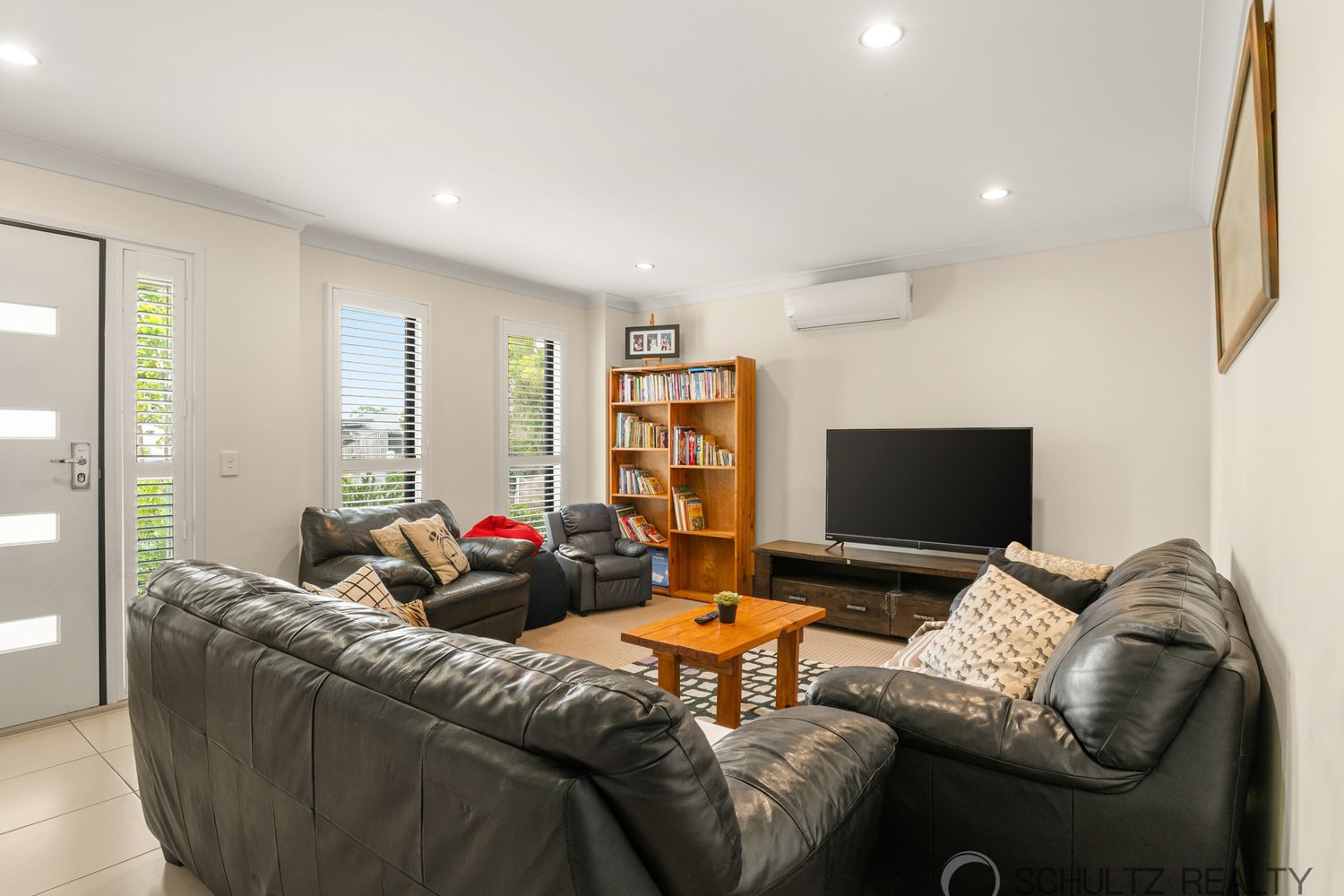 - Living room with tiled flooring, air-conditioning and plantation shutters