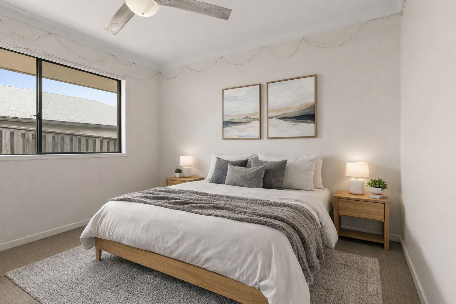 - Covered outdoor entertaining area with tiled floor and ceiling fan