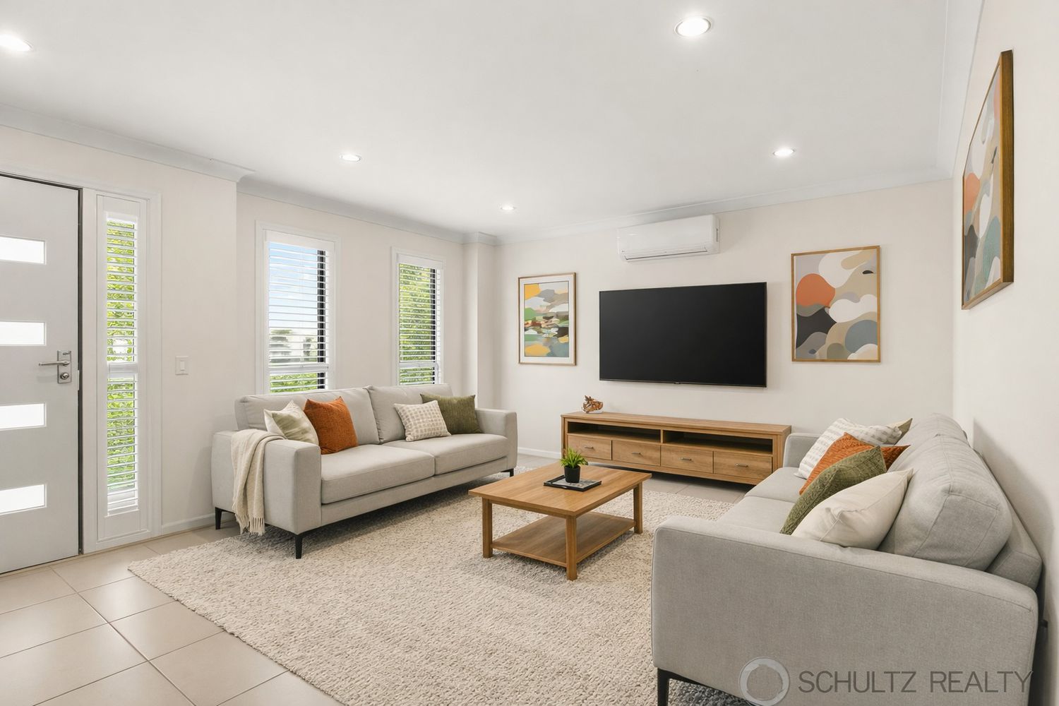 - Living room with tiled flooring, air-conditioning and plantation shutters