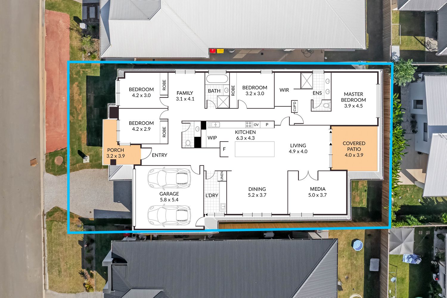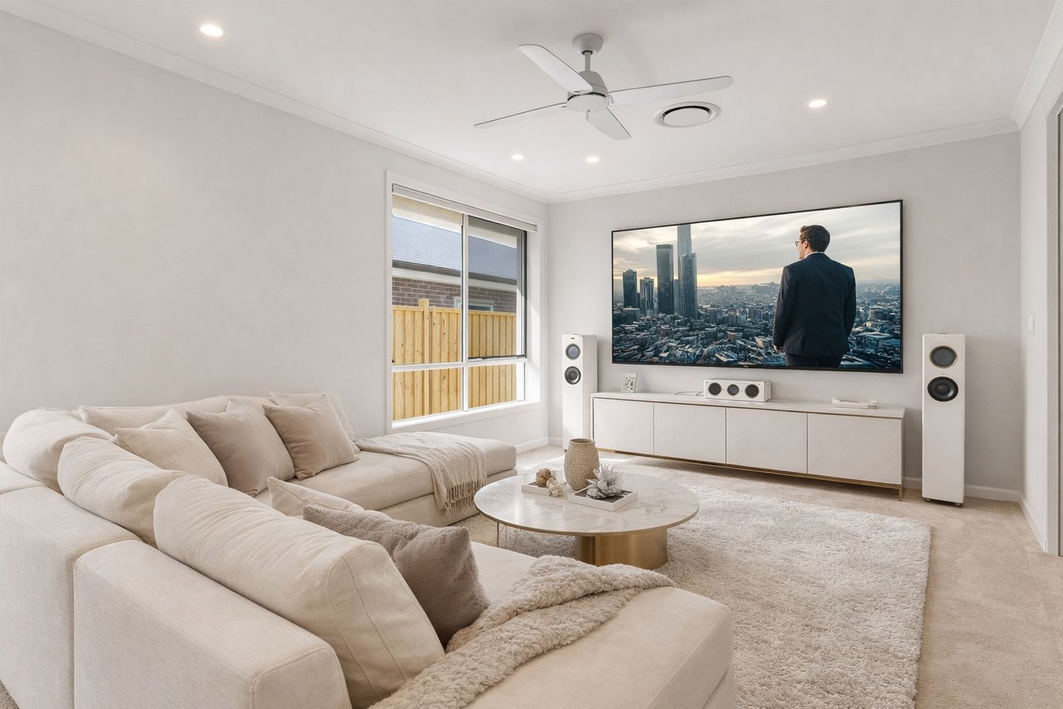 - Separate theatre room with ceiling fan double door entry and 9 double power points