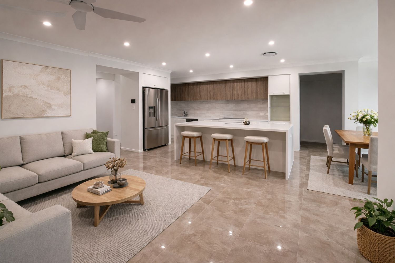 - Spacious open plan kitchen/dining/living area with ceiling fans and stacker doors to the covered outdoor area