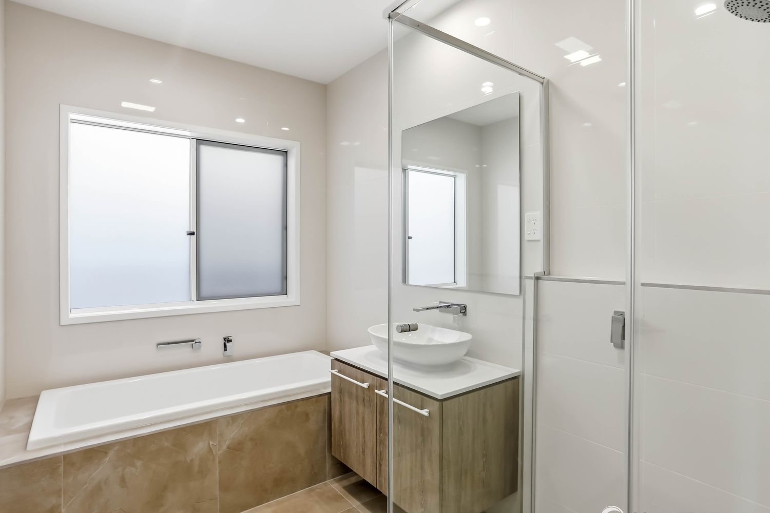 - Main bathroom with separate bath, shower and single vanity