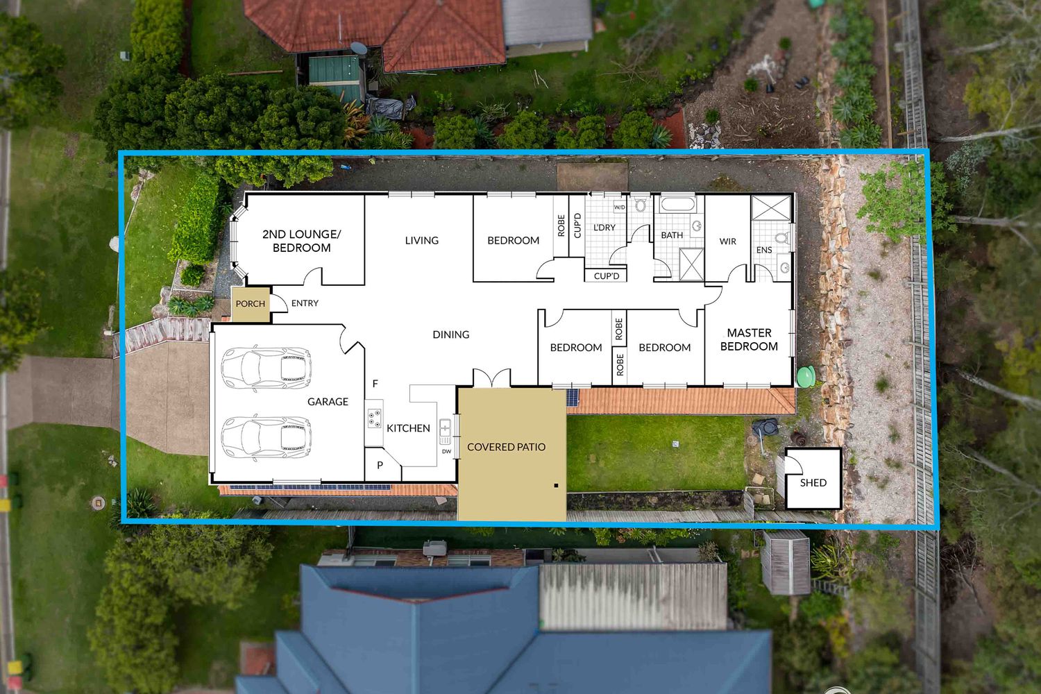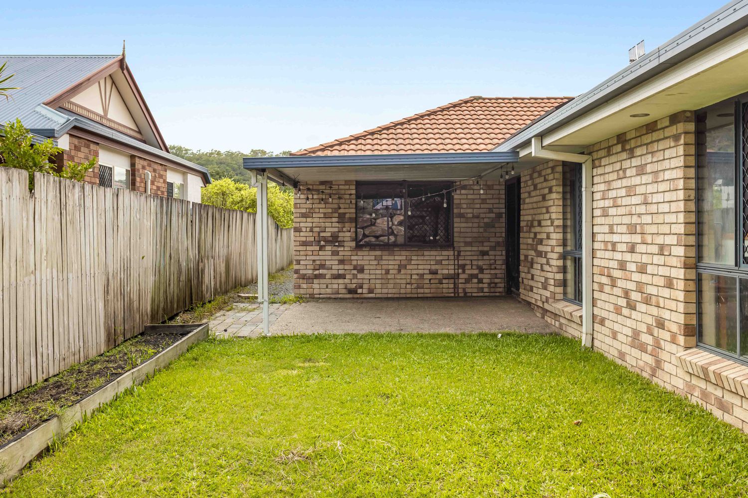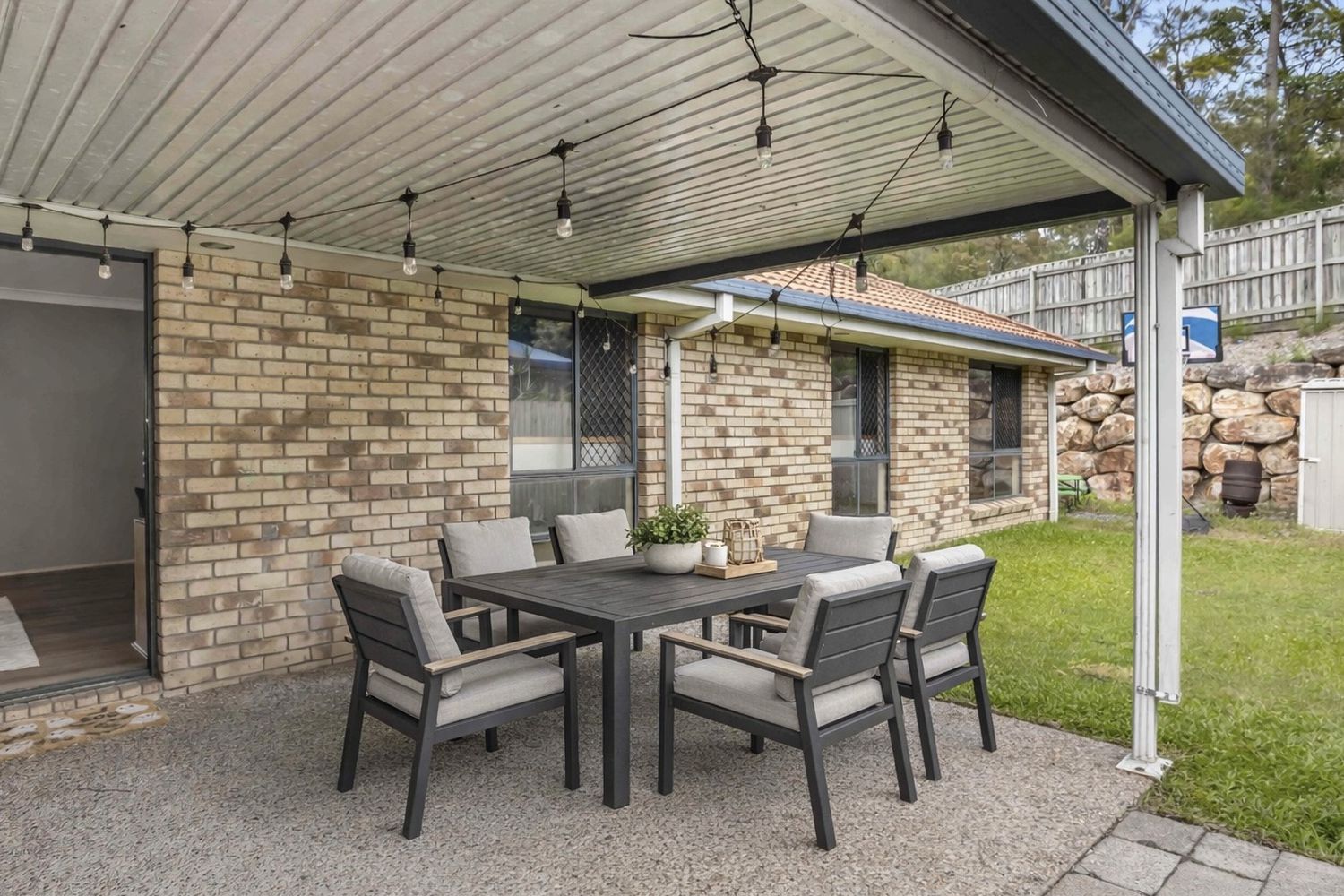 - Covered outdoor entertaining area overlooking the grassy backyard