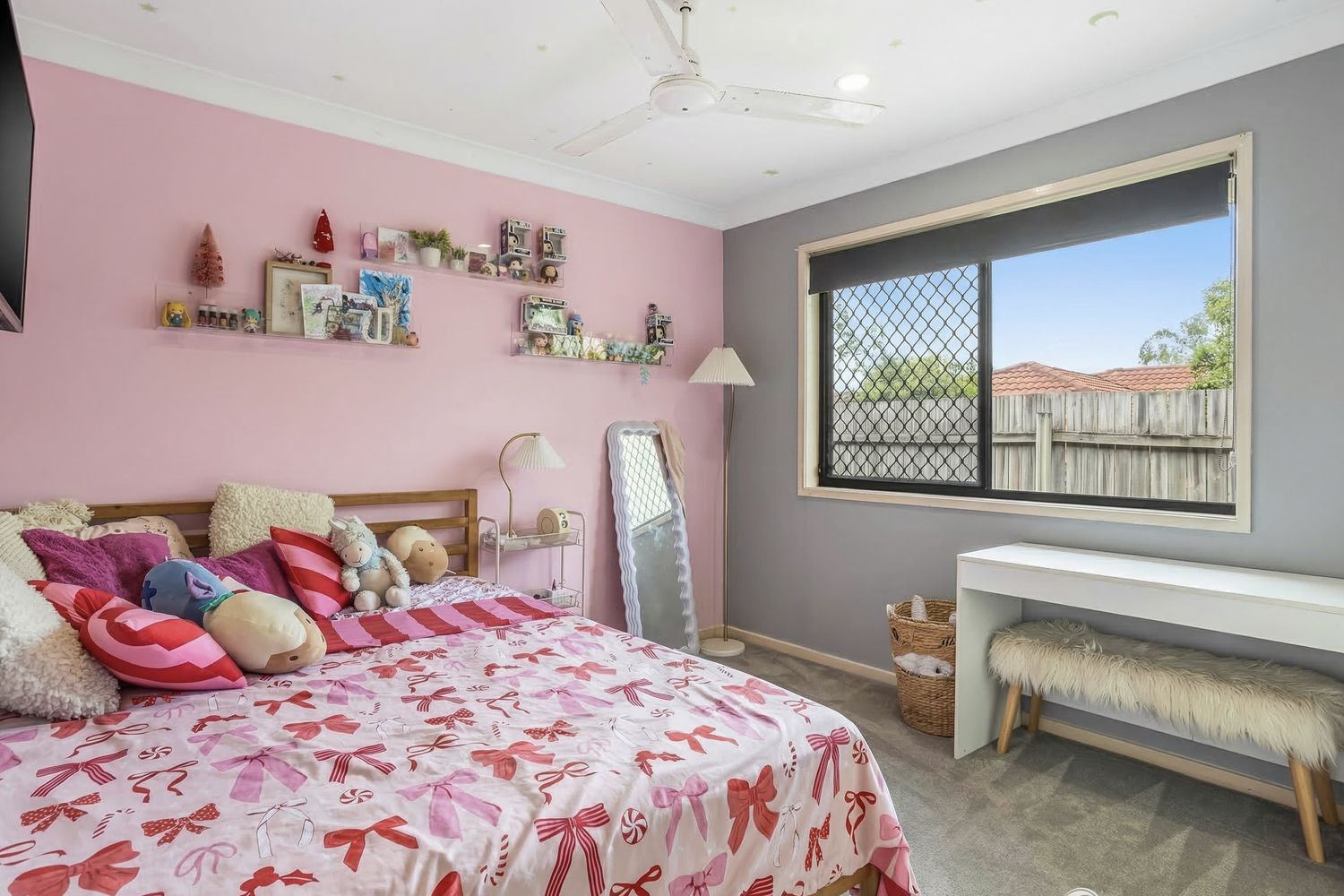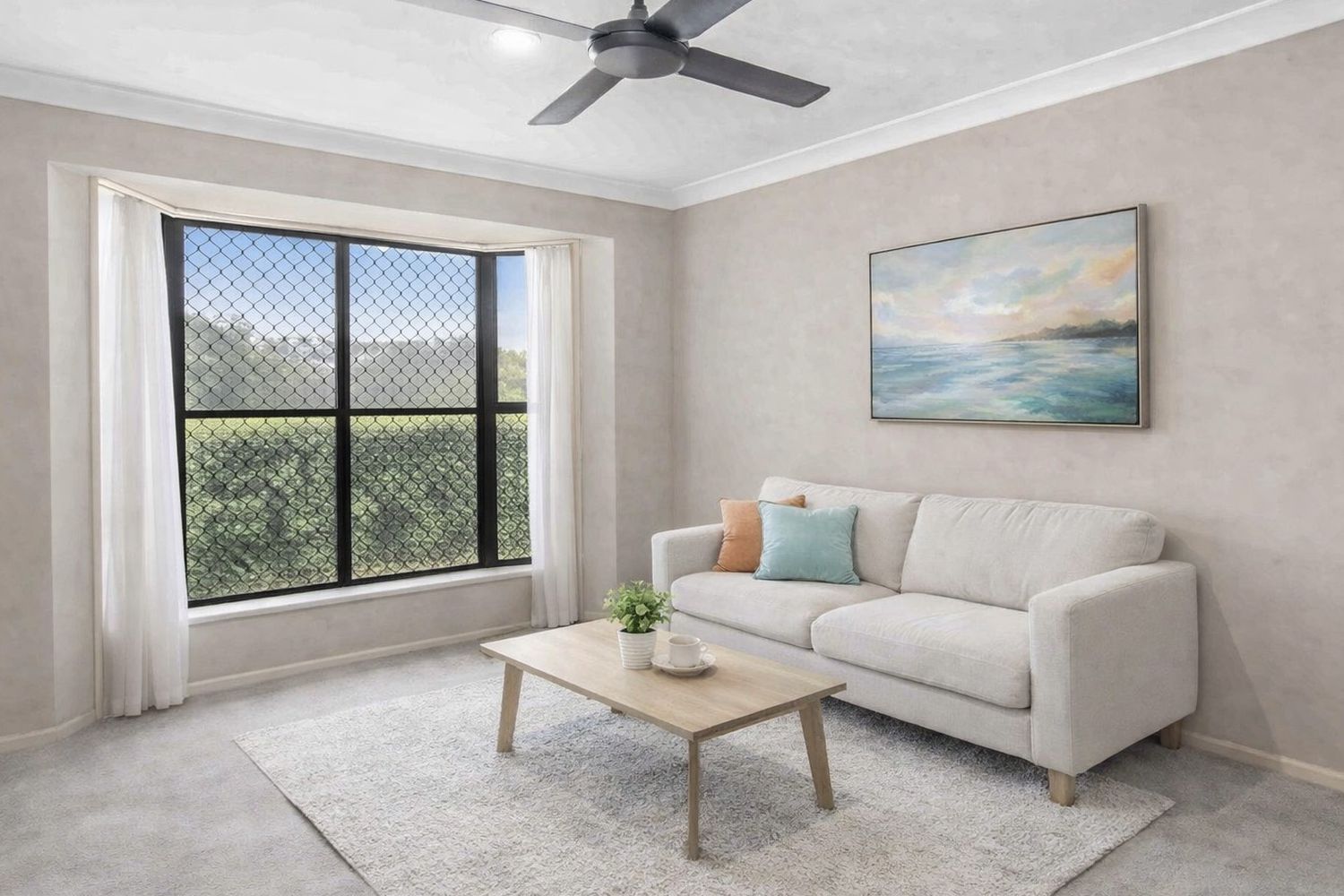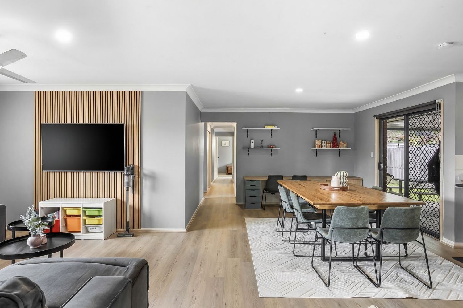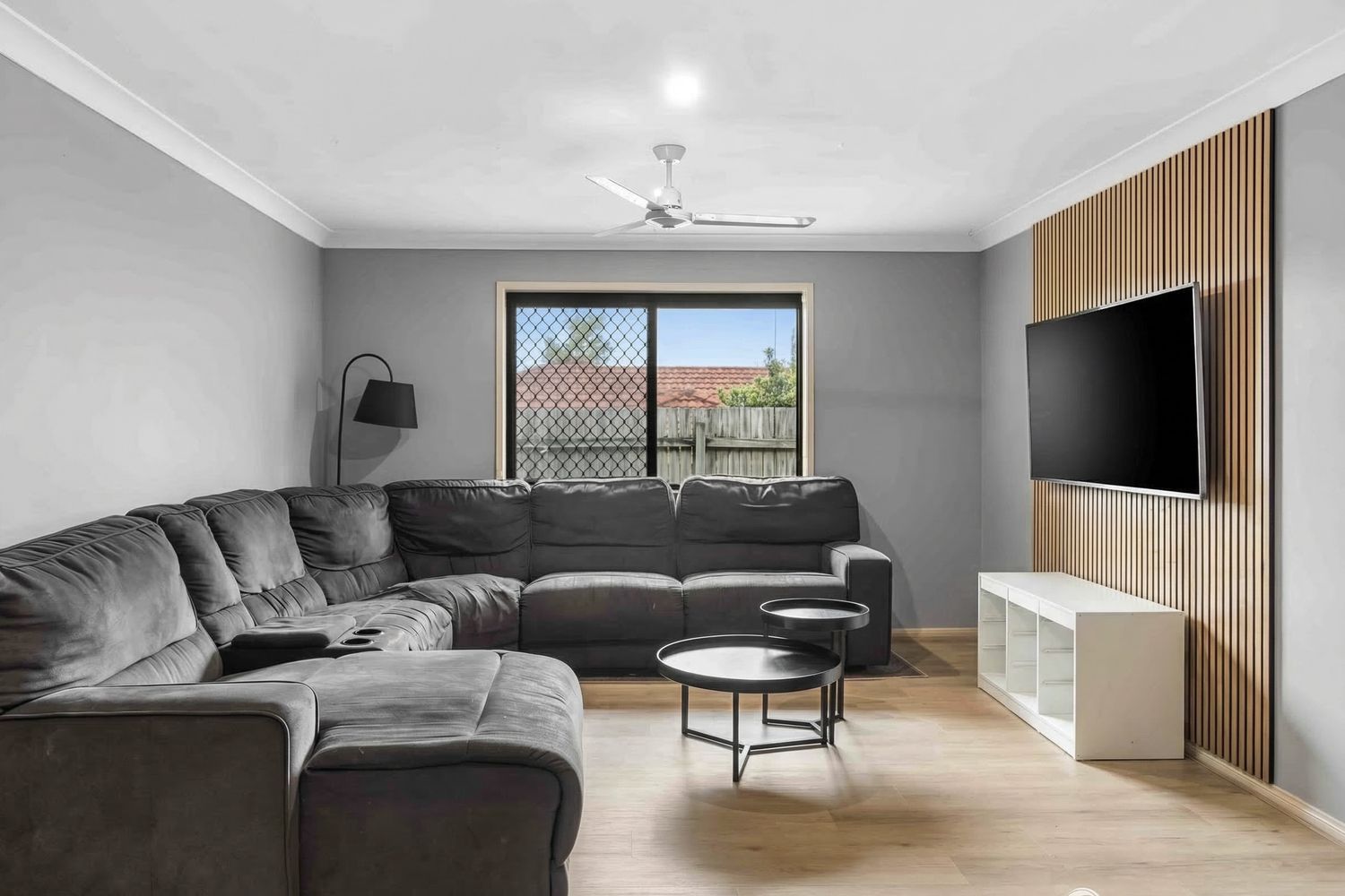 ā Living area with feature wall and ceiling fan