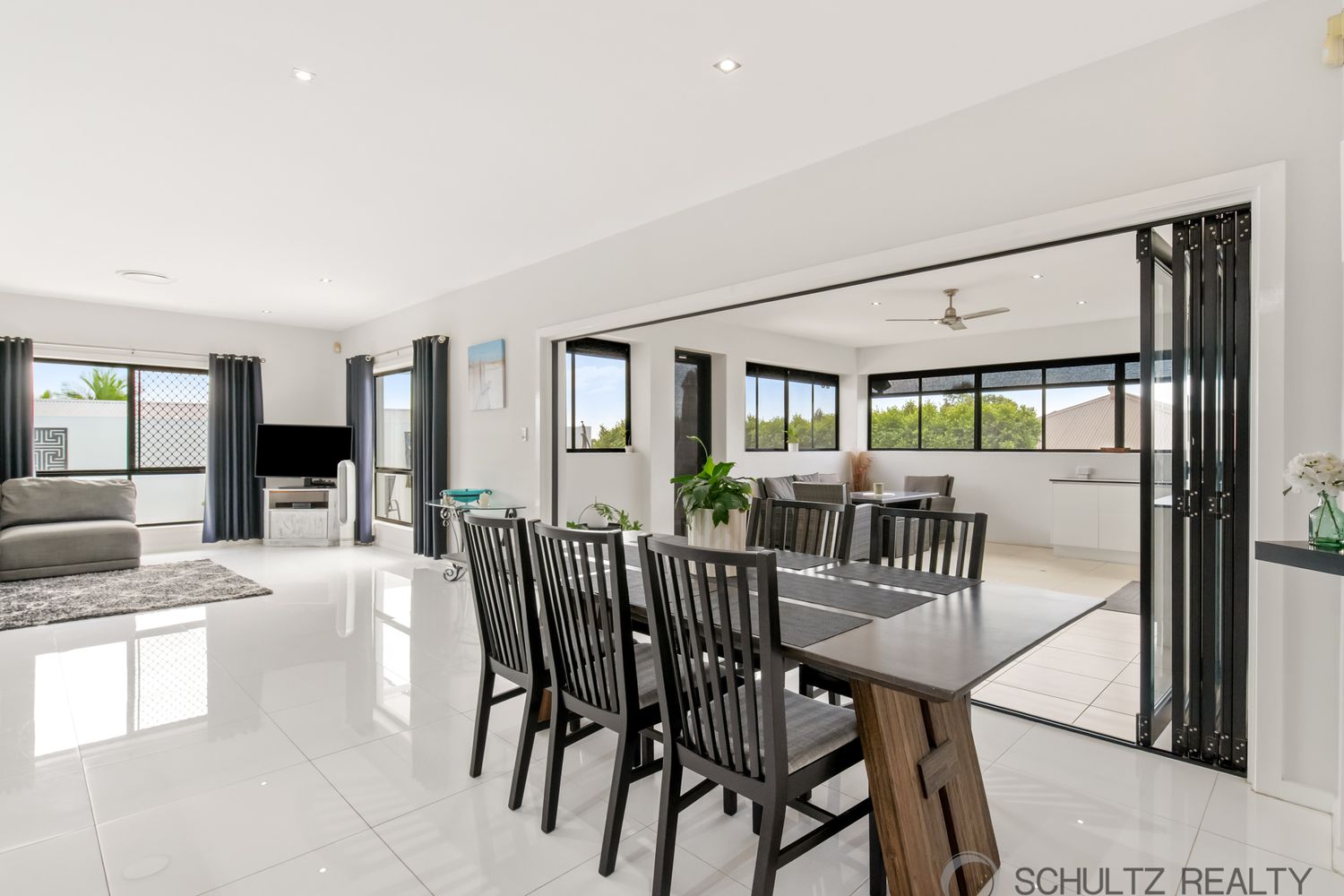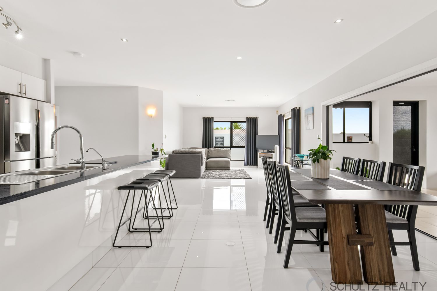 ⢠Expansive open-plan kitchen, living and dining area with white tiled flooring