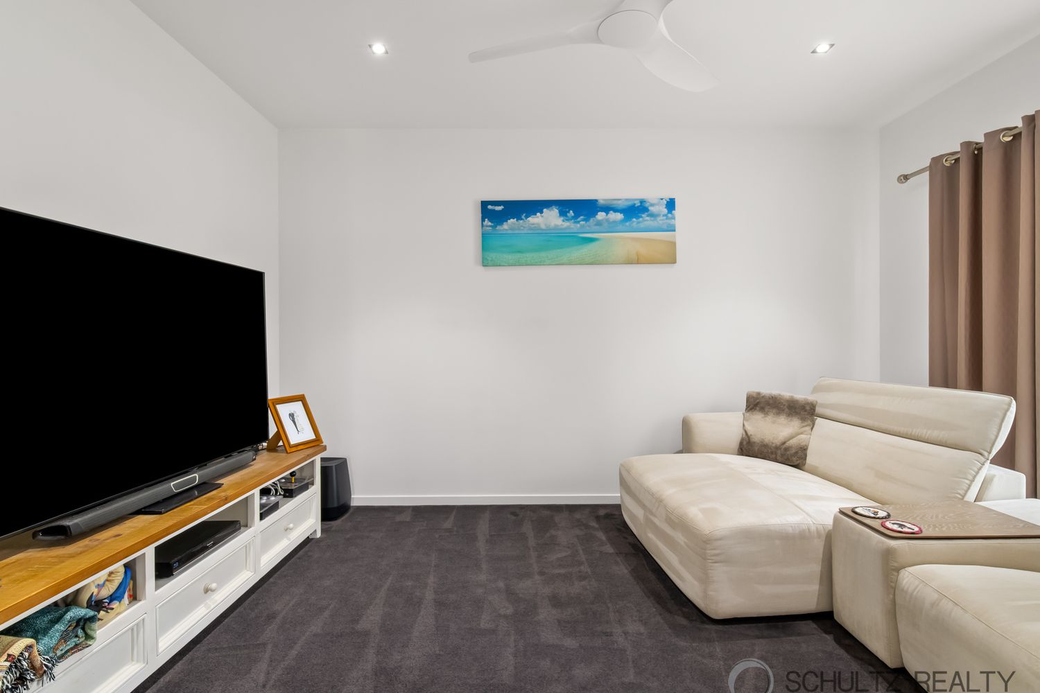⢠Large media room with carpet and ceiling fan