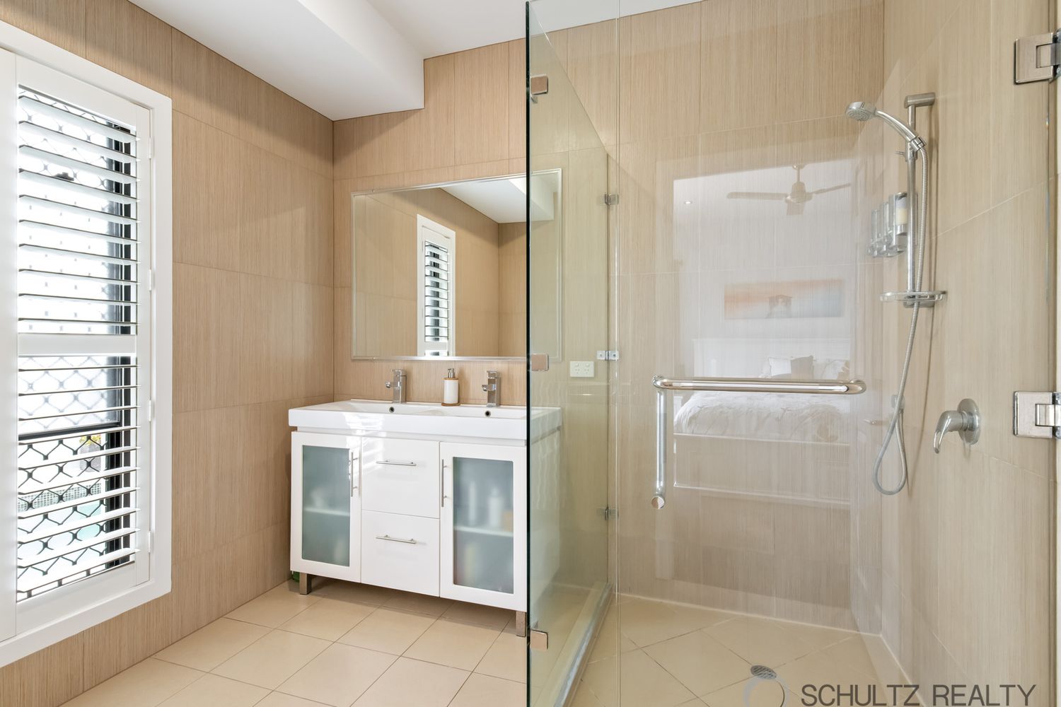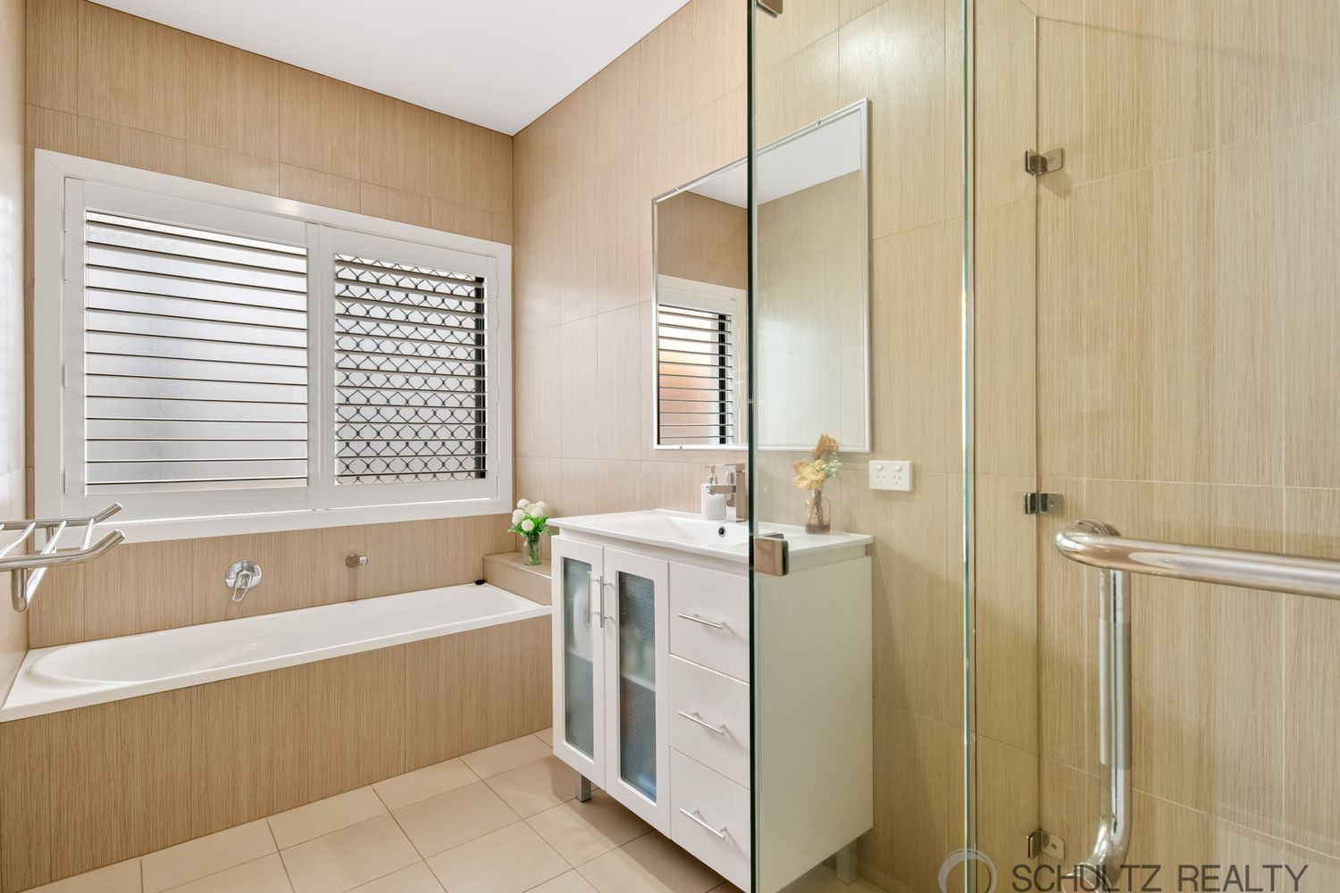⢠Main bathroom with bath, separate shower, vanity and plantation shutters